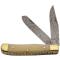 Longueur fermé 11,12cm. Lames en acier damas 128 couches. Dos du ressort guilloché. Lames de type : Clip & Spey. Longueur des lames 7.93cm. Epaisseur des lames 1.58mm. Plaquettes du manche en os. Mitres en laiton.