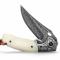 Le manche est une véritable pièce de collection, associant des mitres en acier (Steel Bolsters) brossé à des plaquettes en Bone (Os naturel). Cette combinaison de matériaux nobles offre une prise en main chaleureuse et une esthétique intemporelle qui se bonifiera avec le temps. Le Puppis intègre un mécanisme de sécurité Liner Lock robuste et discret, tandis que l'ouverture est facilitée par un Thumb Stud (ergot de pouce) pour une manipulation fluide et classique.