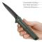 Le manche en Micarta vert offre une excellente prise en main et une durabilité accrue, tandis que le mécanisme de verrouillage Liner Lock assure une sécurité optimale lorsque la lame est déployée. L'ouverture est fluide grâce au système de roulement à billes en céramique. Avec un poids net de seulement 76,8 g et une longueur fermée de 10,81 cm, il se glisse facilement dans une poche.