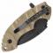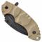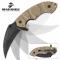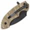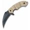 Sa lame agressive de type Hawkbill (bec d'oiseau) et de 7,2 cm est forgée en acier inoxydable, offrant une bonne résistance à la corrosion et une facilité d'entretien. L'épaisseur de lame est de 0,28 cm. La lame présente une finition stonewashed ou blackwash pour un look furtif et une durabilité accrue. Grâce à son mécanisme d'ouverture assistée (Assisted Opening), la lame se déploie à la vitesse de l'éclair, soit via le bouton de pouce, soit par l'ouverture flipper. Les plaquettes de couleur sable du manche sont en G10 finement texturé, assurant une prise en main ergonomique et sûre même dans des conditions humides. La lame est verrouillée en place par un robuste mécanisme Liner Lock.