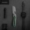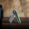 Le manche est une pièce d'ingénierie remarquable : il combine une structure en Aluminium Gris (Grey) avec des inserts en Fibre de Carbone Verte (Green Carbon Fiber), offrant un contraste visuel organique et une légèreté optimale. Ce modèle utilise le mécanisme de verrouillage Top Liner Lock, un système sécurisé situé sur le dessus du manche, permettant une fermeture intuitive sans jamais placer les doigts sur le passage de la lame.