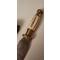 pommeau, virole et garde en laiton ciselé, fusée en Os strié, lame parfaite, au plus épais 0,7 mm, dans son fourreau en cuir épais.