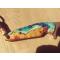 Coutellerie du rat noir, modèle Caracal avec un double faux tranchant, en acier inoxydable N690 co, lame tirée en long satinée, manche hybride en loupe d'amboine et résine colorée (bleu brillant /blanc) avec sa perle assortie aussi en loupe d'amboine, résine et G10 blanc. Les intercallaires entre la lame et le manche sont en G10 noir.