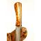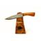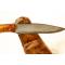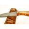 Une vraie réalisation à l’ancienne pour ce couteau de trappeur qui allie le vieux fer d’un cerclage de roue de carriole et l’acier d’une vieille lime, le tout soudé au feu comme il se doit. Un passage à l’acide permet de révéler le motif du vieux fer sur le corps et la démarcation du tranchant rapporté en acier. Les plaquettes en érable ondé teinté se prêtent parfaitement à cette réalisation.