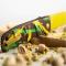 Un couteau EDC aux couleurs jaune, vert et marron avec empreintes de doigts. Un couteau robuste pour vos activités du quotidien.