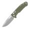 Une lame lisse à trou stonewashed de forme Spear Point, 8 cm en acier N690Co 58-60HRC avec bouton de sécurité.
