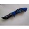 Couteau Tête de mort N° 1 Manche bleu - ouverture de la lame par appuie sur bouton partie supérieur, système de blocage de la lame (repli de cette lame par appuie sur barre de blocage coté tranchant) - clip de ceinture - lame d'environ 8 cm - longueur totale d'environ 20 cm -- Voir les photos.