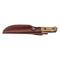 Le profil de la lame de type drop point est parfait pour les usages polyvalents, tandis que le couteau est livré avec un étui en cuir équipé d'une fermeture à pression, permettant le port à la ceinture.