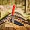 Ce couteau se distingue par sa construction intégrale (full-tang), assurant une robustesse et une stabilité exceptionnelles. Le manche en Micarta offre une prise en main confortable et une résistance aux intempéries, idéale pour une utilisation en extérieur. La garde intégrée et l'empreinte pour les doigts offrent une sécurité supplémentaire lors de la manipulation du couteau. L'étui en cuir permet un transport sûr et pratique à la ceinture.