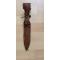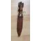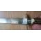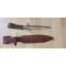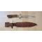 Couteau de chasse artisanal, lame droite, fabrication Française en inox, bois de cerf de qualité en bon état. Fourreau original, monté entièrement avec des lacet en cuir genre médiéval ou trappeur. Longuer du couteau 28cm, lame de 16cm de long et 19cm de large. 5mm d'épaiiseur à la garde.