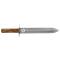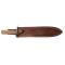 Couteau à lame fixe ajourée au niveau du ricasso avec représentation d'une tête de cerf. La lame à double tranchant de 27 cm supporte un manche en bois poncé huilé. Cette dague sera idéale pour servir le gibier ou découper la viande. Le fourreau en cuir cousu main qui l'accompagne pour protéger la lame de la poussière et des chocs dispose d'un passant pour le port à la ceinture.