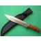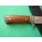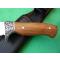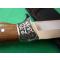 Grand couteau de chasse, finition haut de gamme, mitres en acier avec gravures relief de rinceaux, garde un quillon assurant la sécurité à la chasse au grand gibier, cotes en bois de rose à la magnifique couleur miel, montage plate-semelle garantissant solidité, lame en acier inoxydable.