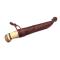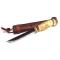 Grand couteau de chasse Lapon traditionnel avec une lame massive et brute de finition artisanale, forgée dans un acier à haute teneur en carbone, et tranchante comme un rasoir. Le manche galbé a une très bonne prise en main et présente un visuel attractif grâce au mariage de deux types de bois différents. Livré dans son étui traditionnel lapon en cuir décoré de motifs rennes. Matériau de la lame : acier forgé à haute teneur en carbone Matériel du manche : bouleau frisé et traité thermiquement + tremble Longueur totale : 27 cm Longueur de lame : 14,5 cm Poids du couteau : 230 g Le bouleau frisé et le bois de tremble étant des produits naturels, ils peuvent varier en couleur. Chaque couteau sera donc différent et unique dans ses teintes et les nervures du bois.