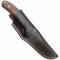 Ce couteau se distingue par sa lame en acier damas, forgée à partir de plusieurs couches d'acier pliées et martelées ensemble, créant des motifs uniques et un tranchant exceptionnel. La finition satinée de la lame met en valeur la beauté du damas. Le manche, fabriqué à partir d'une combinaison de résine, de loupe de bois et de laiton, offre une prise en main confortable et une esthétique raffinée. L'étui en cuir protège la lame et permet un port facile à la ceinture.
