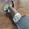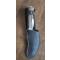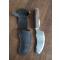 Beau couteau a dépecer avec lame en acier double tranchant de 13,5 centimètres manche en bois de cerf et bout en bronze ciselé de cartouche ,feuilles et patte de lion , étui en gros cuir cousu ,couteau artisanal.,très bon état .