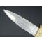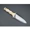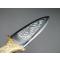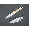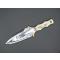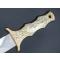 Couteau droit avec lame inox à double tranchant, manche et fourreau à motif de feuillage et tête de cerf. En très bon état. Manche couleur doré. Attache de ceinture sur le fourreau.