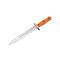 Le manche en TPR, de couleur orange, garantit une prise en main confortable et sécurisée, même dans des conditions humides. La double garde fixe renforce la sécurité lors de l'utilisation, empêchant tout glissement accidentel de la main vers la lame. Le couteau est accompagné d'un étui en nylon robuste, équipé d'un passant pour ceinture, facilitant son transport et son accessibilité.