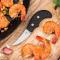 Le Shrimp un couteau fixe pleine soie à la forme d'une crevette avec un niveau de fonctionnalité très élevé. Une lame lisse en acier D2 en forme Drop Point et couleur grise. Une poignée en G10 noir très ergonomique, rivetd en laiton pour accentuer sur le contraste des couleurs. Trou à l'arrière pour le passage d'une cordelette.