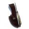 Un étui en cuir brun de haute qualité surpiquage blanc et bouton pression, port vertical.