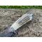 Le manche combine bois de cerf, imitation ivoire haute qualité et éléments en laiton pour une prise en main confortable et équilibrée. Chaque pièce présente des variations naturelles liées aux matériaux utilisés.