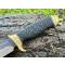 Avec son plat de lame sculpté et peint, son pommeau en tête de loup doré, et sa construction robuste, ce couteau allie style artisanal, esthétique