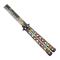 Couteau papillon Third, lame style peigne (non coupante), manche à trous 13 cm acier inox. Finition "têtes de mort".