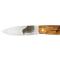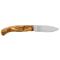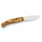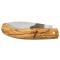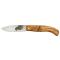 Le manche en bois d'olivier, avec sa finition naturelle, confère au couteau une esthétique élégante et une prise en main confortable. La couleur blanche de la lame contraste harmonieusement avec le manche, ajoutant une touche de sophistication à l'ensemble. Le système de sécurité à cran forcé garantit une utilisation sécurisée, en maintenant la lame fermement en position ouverte.