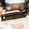 Manche en bois d'ébène rustique, éléments couleur laiton comme la platine, la bague extérieure de la vis de pivot de la lame et le trou pour la lanière.