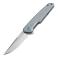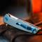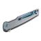 Manche en aluminium gris 6061-T6. Eléments anodisés bleu irisé comme le clip de sécurité, la vis de pivot de la lame et les vis du manche, ricasso décoratif.