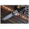 L’acier damas utilisé est constitué de plusieurs couches et a été plié et frappé avec deux types d'acier, un acier tendre et acier dur (1095 et 15N25) afin d’obtenir une pièce de qualité de 150 à 200 couches selon les modèles.