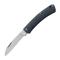 Lame lisse forme Drop Point, acier allemand 420 dureté 54- 56 HRC avec une finition stonewash et facile à affûter. Ouverture par entaille d'ongle.