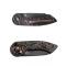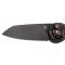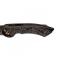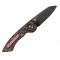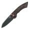 Ouverture par "Finger Safe" un ergot placé en haut du manche, placé dans un demi-cercle il suffit de le faire pivoter vers le haut pour que la lame s'enclenche. Un Manche sublime de 11,5cm en fibre de carbone incrusté de fil de cuivre texturé comme une peau de serpent. Excellente ergonomie. Les vis en titane anodisées rose, entretoise en titane PVD noir, bouton anodisé titane rose