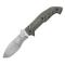 "Meskwaki Tracker" gravé sur la lame. Manche en micarta vert et vis noires, un manche ergonomique qui épouse parfaitement la structure de la mainavec ses empreintes de doigts.