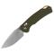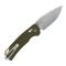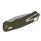 Poignée profilée en G10 olive avec anneaux de finition et entretoise arrière en aluminium anodisé or pour une esthétique et une prise en main améliorées. Clip de poche discret et réversible pour port à gauche/à droite ; boucle pour dragonne intégrée. Vis et clip de poche microbillés, bague de pivot et entretoise arrière anodisées or.