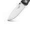 Une lame forme Drop Point en acier M390 à finition satinée avec ergots de pouce amovibles à cran intérieur.