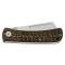 Le couteau pliant QSP Hedgehog se distingue par sa lame en acier 14C28N, reconnue pour sa robustesse et sa capacité à conserver un tranchant lisse et précis. Ce modèle présente un profil de lame de type rasoir, idéal pour des coupes nettes et efficaces. Le manche, fabriqué en fibre de carbone, arbore une élégante finition dorée, offrant à la fois légèreté et résistance.