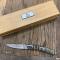 Ce couteau pliant vous séduira avec sa forme Thiers® et son manche en molaire de mammouth. Mais plus encore, il est doté d’un mécanisme d’ouverture et de fermeture très particulier qui fait toute sa particularité.