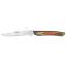 On ne peut pas dire qu'il soit léger mais il ne se fait pas sentir en poche(si tant est qu'on ait encore le droit d'avoir un couteau en poche).Son allure générale le démarque de ce qui se fait actuellement la mitre de tête en acier poli et le bois teinté bleu foncé ne sont pas étrangers évidemment à cet aspect. Les ajustages de platine ressort n'appellent aucun reproche .La lame se situe pile poil au milieu de son logement ce qui n'est pas toujours le cas et il coupe :à ce sujet la remarque précédente peut aussi s'appliquer .Donc il est parfait sauf que l'on ne peut pas l'ouvrir sans se casser les ongles ou se couper tellement le ressort est dur ;rien n'y fait même les gouttes d'huile.