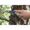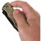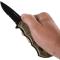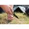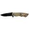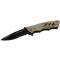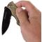 Couteau de poche pliant à camouflage avec lame en acier noir, dentelée sur sa moitié. Équipé d'un clip ceinture pour utilisation pratique. Décapsuleur intégré. Design ergonomique.