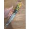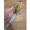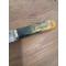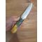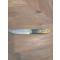 Couteau de chasse puukko, lame forgée en acier carbone XC75, trempe à l'huile, émouture plate. Passage de la lame dans du perchlorure. Manche en bouleau marbré teinté. Montage sur soie. Étui en cuir