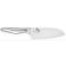Couteau santoku de la gamme Kai Seki Magoroku Shoso Aspect """"tout métal"""" sans structure entre la lame et le manche, motifs en losanges sur le manche en inox. Longueur de lame : 14,5 cm Aspect satiné Forgée à partir d'acier inoxydable Modybdène Vanadium 1 K6, d'une teneur de 0.8% en carbone et d'une dureté Rockwell de 58 +/- 1, la lame offre une grande robustesse et une tenue de coupe irréprochable. Cette résistance de coupe - obtenue par un nouveau procédé d'affûtage à vitesse lente en trois étapes spécifique à Kai - réduit considérablement le frottement entre la lame et le produit et permet une meilleure découpe des aliments Made in Japan