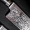 La finition brillante des lames est sublimée par un grain Damas. Hybride entre un Santoku et un couteau de chef, sa forme particulière est particulièrement adaptée à un hachage précis. Les lames sont à double tranchant.
