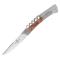 Lame de 11cm en acier inoxydable Sandvik 14C28N(58-59HRC) , fermeture par cran forcé et émouture complète de la lame, 2 mitres en acier mat inoxydable.