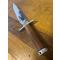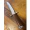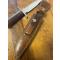 Magnifique couteau, techniquement difficiles à réaliser a la trempe, compte tenu de ses dimensions, mais d'une ligne moins esthétique que la série des Tronçais. Étui tres épais pour la rigidité et la sécurité.