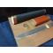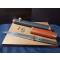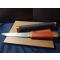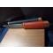 Manche de 120mm en sapin, chêne et cuivre. Gainage en cuir. Goupille de maintien en bambou