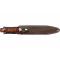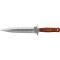 COUTEAU DE CHASSE AVEC UNE LAME DE PRES DE 240 MM DE LONG ET 40 MM DE LARGE, PLUS UNE RAINURE POUR LE SANG. LAME EN ACIER 440C ORNEE D'UN SIGNE DE BRANCHE, D'UN SALUT DE CHASSEUR ET DU LOGO WALTHER. LIVRE AVEC ETUI EN CUIR POUR CEINTURE.