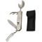 Six, c'est le nombre total de ses fonctions : une cuillère pliante, une fourchette pliante et un couteau pliant ainsi qu'un décapsuleur, un ouvre-boîte et un anneau. Solide et anticorrosion (il ne craint pas l'eau), il profite pleinement d'une fabrication à 100% en acier inoxydable, y compris le manche. Si besoin, il peut se séparer en 2 parties : la fourchette d'un côté et la cuillère ou le couteau de l'autre. La housse fournie avec ce couvert de bivouac est pourvue d'un passant de ceinture. La fixation à une ceinture, à un sac de trekking ou à une lanière quelconque est donc possible. Le poids du couvert est de 79 grammes sans la housse et 85 grammes avec la housse. C'est le compagnon par excellence du campeur et du randonneur. Son surnom de couteau du campeur est pleinement mérité.