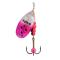 Cuiller tournante Aglia-E Brite de chez Mepps, composé d'un corps metal et d'une palette argent et rose.