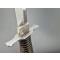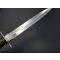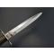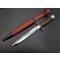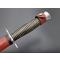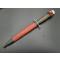 Petite dague de chasse ou de lancer à lame inox de 15.5cm, traces d'oxydation au talon, poignée en résine noire séparée par des rondelles de laiton, pommeau en maillechort, fourreau en cuir rouge, bout en plastique noir. Longueur totale 25,5cm
