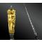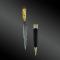 Dague à lame en acier à un tranchant, achevée en pointe et au dos incisé de douze cercles. Noix à bagues saillantes, mitre avant et arrière en argent – cette dernière est achevée en bouton.